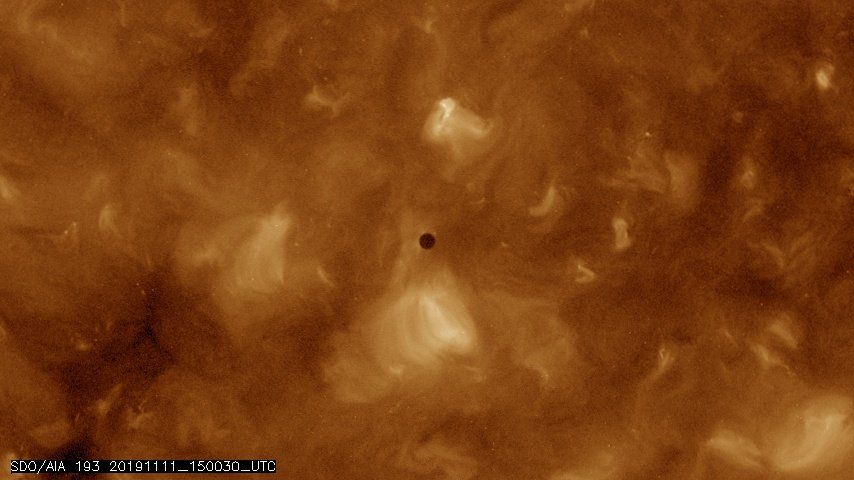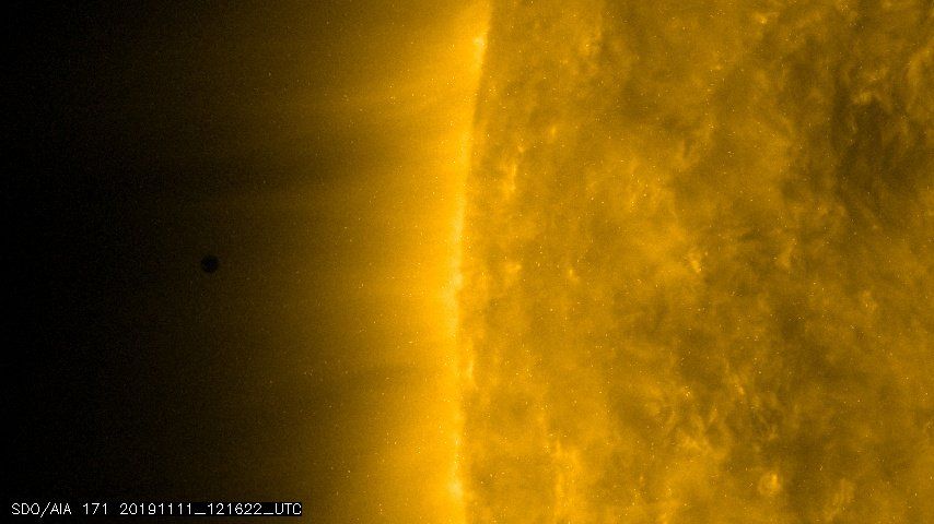 ↖ Mercure visible dans la couronne solaire depuis l'espace lundi 11 novembre 2019 à 13h21 . Crédits NASA